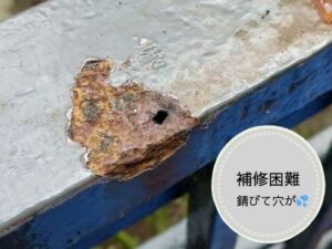 初期段階のサビなら、ケレン作業で削り落としてサビ止め塗装をすれば再生可能です。しかし、放置して進行すると鉄そのものが腐食して薄くなり、穴が開いてしまうこともあります。この状態になると、塗装だけでは補修できず、部材の交換が必要になるため、費用も大幅に増えてしまいます。