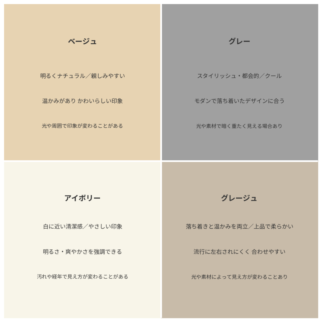 | グレー | スタイリッシュで都会的。クールな印象 | モダン・落ち着いたデザインに合う | 光や素材の影響で、暗く重たい印象やクールすぎる印象になる場合がある |